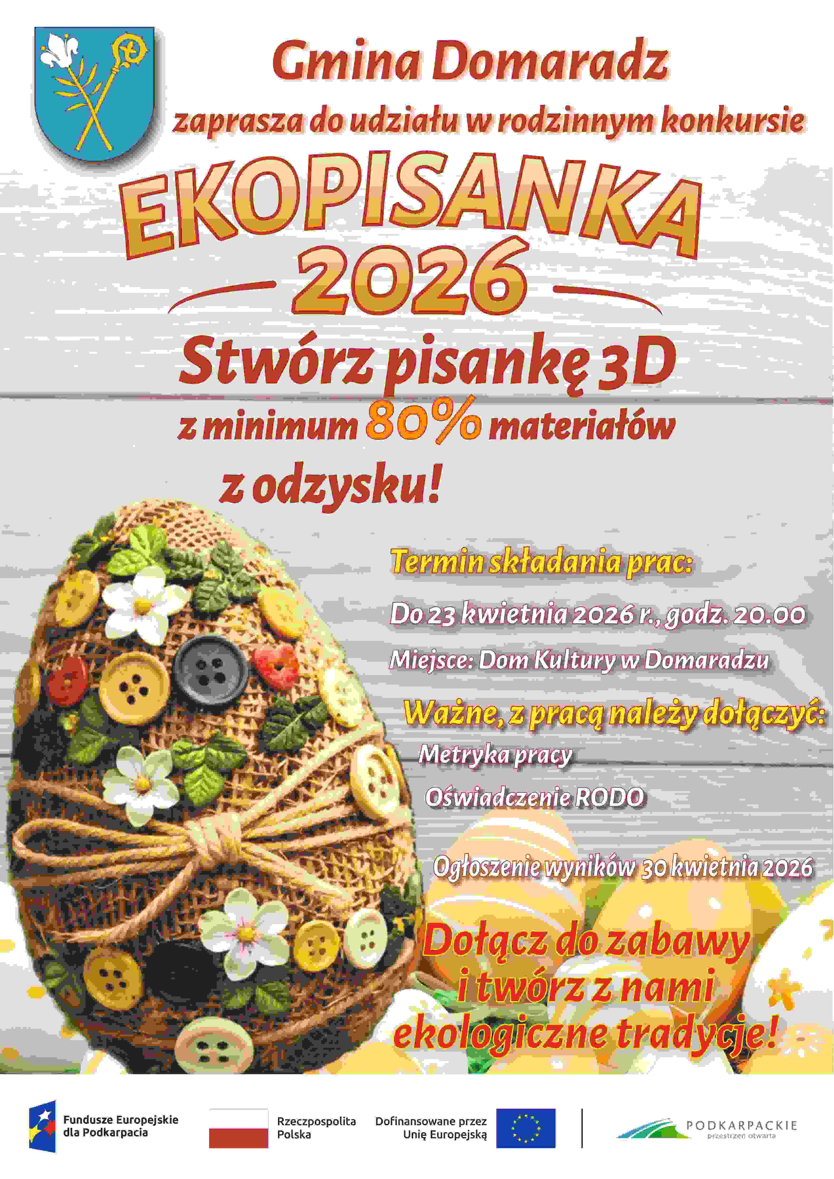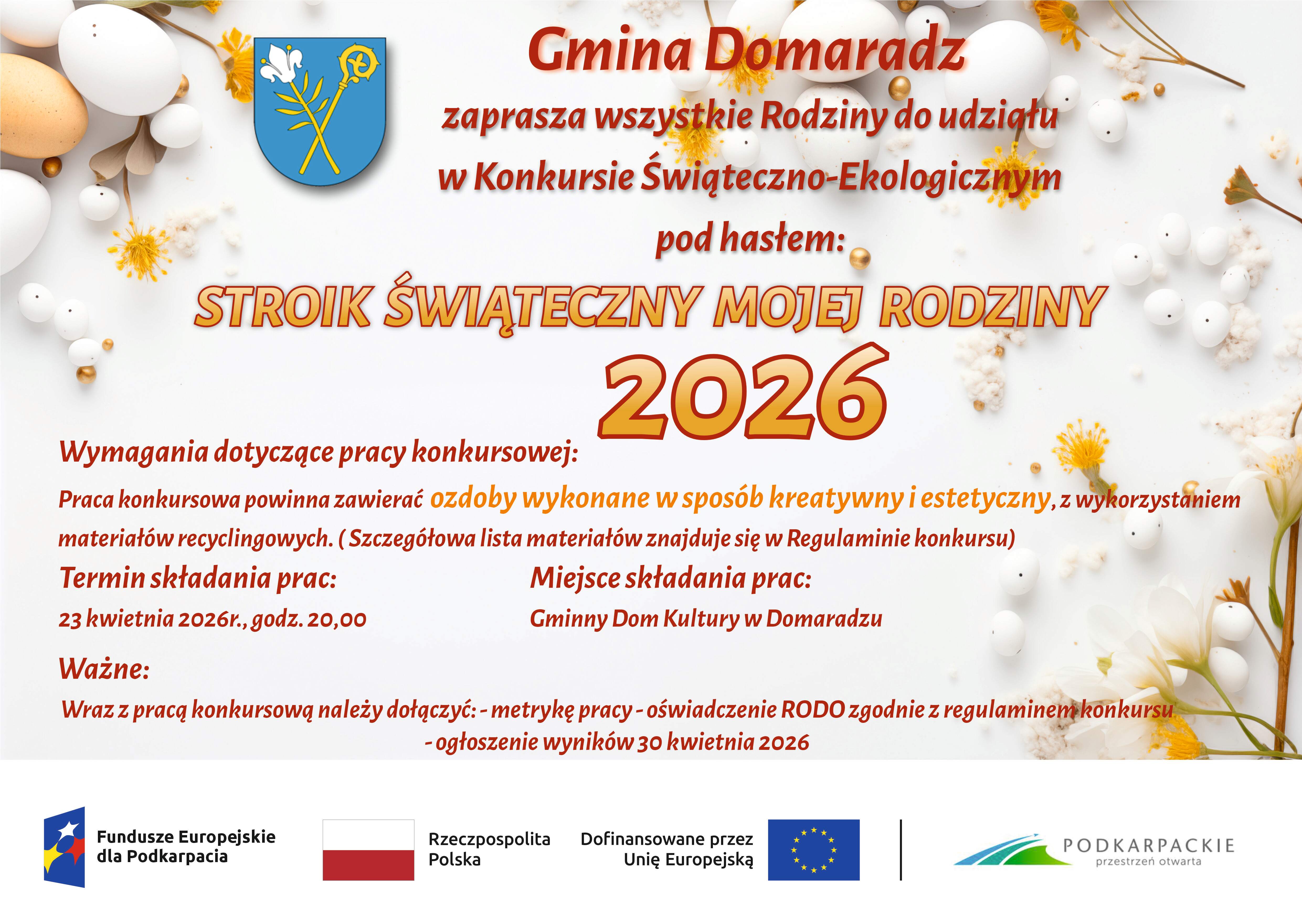 Gmina Domaradz zaprasza wszystkie Rodziny do udziału w Konkursie Świateczno-Ekologicznym pod hasłem "EKOPISANKA" oraz "STROIK ŚWIATECZNY MOJEJ RODZINY". Szczegóły konkursów w regulamianach.